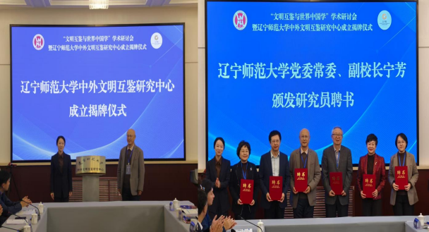 致辞环节后,举行辽宁师范大学中外文明互鉴研究中心揭牌仪式。在与会嘉宾的共同见证下,宁芳副校长与厦门大学李无未教授共同为研究中心揭牌。随后,宁芳副校长为中心首批兼职研究员蔡美花教授、李无未教授、刘洪涛教授、马金科教授、孙惠欣教授、孟凯研究员颁发聘书。